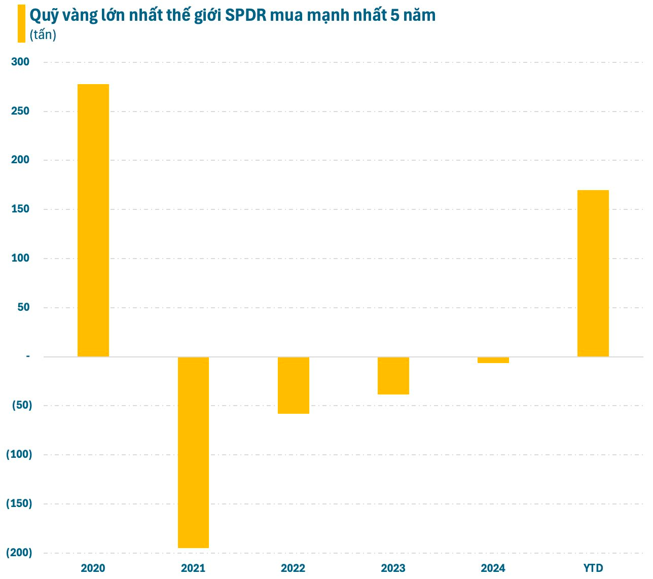 Theo dữ liệu thống kê, quỹ vàng lớn nhất thế giới SPDR Gold Shares đã mua thêm 170 tấn vàng (khoảng 10 tỷ USD) từ đầu năm 2025 đến nay, ghi nhận lực mua mạnh nhất kể từ năm 2020. Động thái đã chấm dứt xu hướng ròng vốn rút ra khỏi quỹ vàng này trong 4 năm trước đó. Điều này phản ánh niềm tin mạnh mẽ của nhà đầu tư vào vàng như một “nơi trú ẩn an toàn” giữa thế giới đầy biến động.