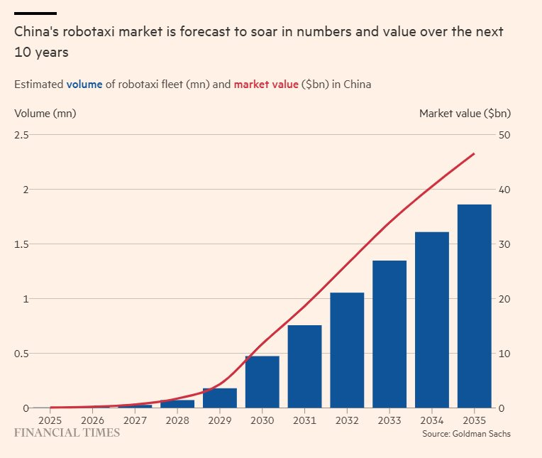 Ước tính của Goldman Sachs cho thấy thị trường robotaxi Trung Quốc sẽ tăng từ 54 triệu USD hiện nay lên 47 tỷ USD vào năm 2035, với 1,9 triệu xe hoạt động vào năm 2035, tương đương một phần tư thị trường taxi toàn quốc, cao hơn nhiều so với 4.000 chiếc và 0,1% thị phần hiện nay.