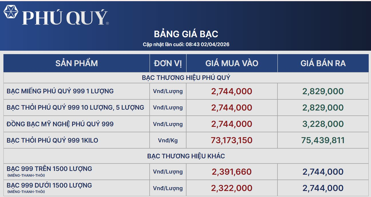 Theo dữ liệu từ Tập đoàn Vàng bạc Đá quý Phú Quý, giá bạc hôm nay 999 1 lượng niêm yết ở mức 2.744.000 đồng/lượng (mua vào) và 2.829.000 đồng/lượng (bán ra).