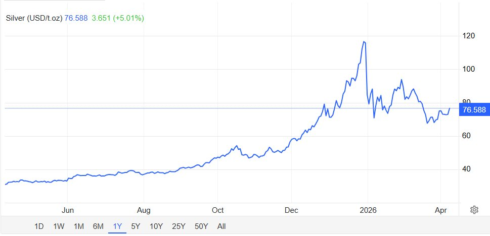 Giá bạc thế giới ghi nhận đà tăng mạnh trong phiên giao dịch ngày 8/4, khi vượt mốc 76 USD/ounce, tăng hơn 4% và lên mức cao nhất trong vòng ba tuần. Diễn biến này diễn ra trong bối cảnh căng thẳng địa chính trị tại Trung Đông có dấu hiệu hạ nhiệt, góp phần cải thiện tâm lý thị trường tài chính toàn cầu.