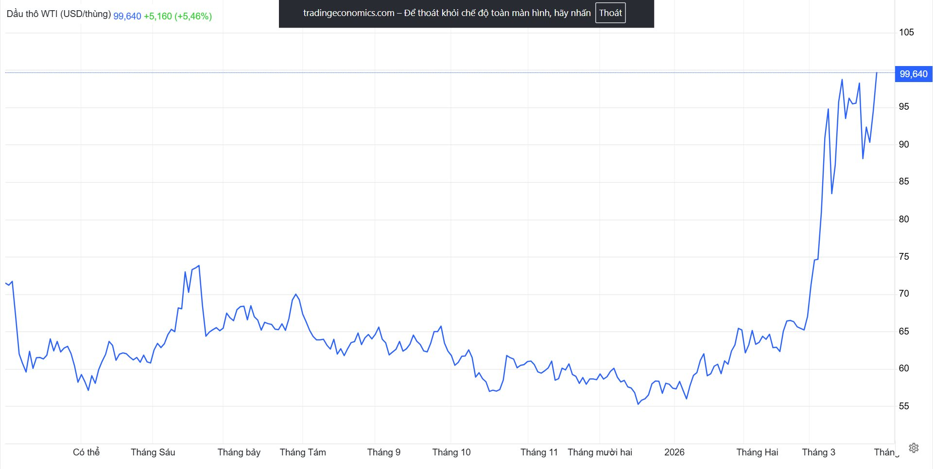 Tại thị trường Mỹ, giá dầu West Texas Intermediate (WTI) cũng ghi nhận mức tăng 5,16 USD, tương ứng 5,5%, chốt phiên tại mốc 99,64 USD một thùng.