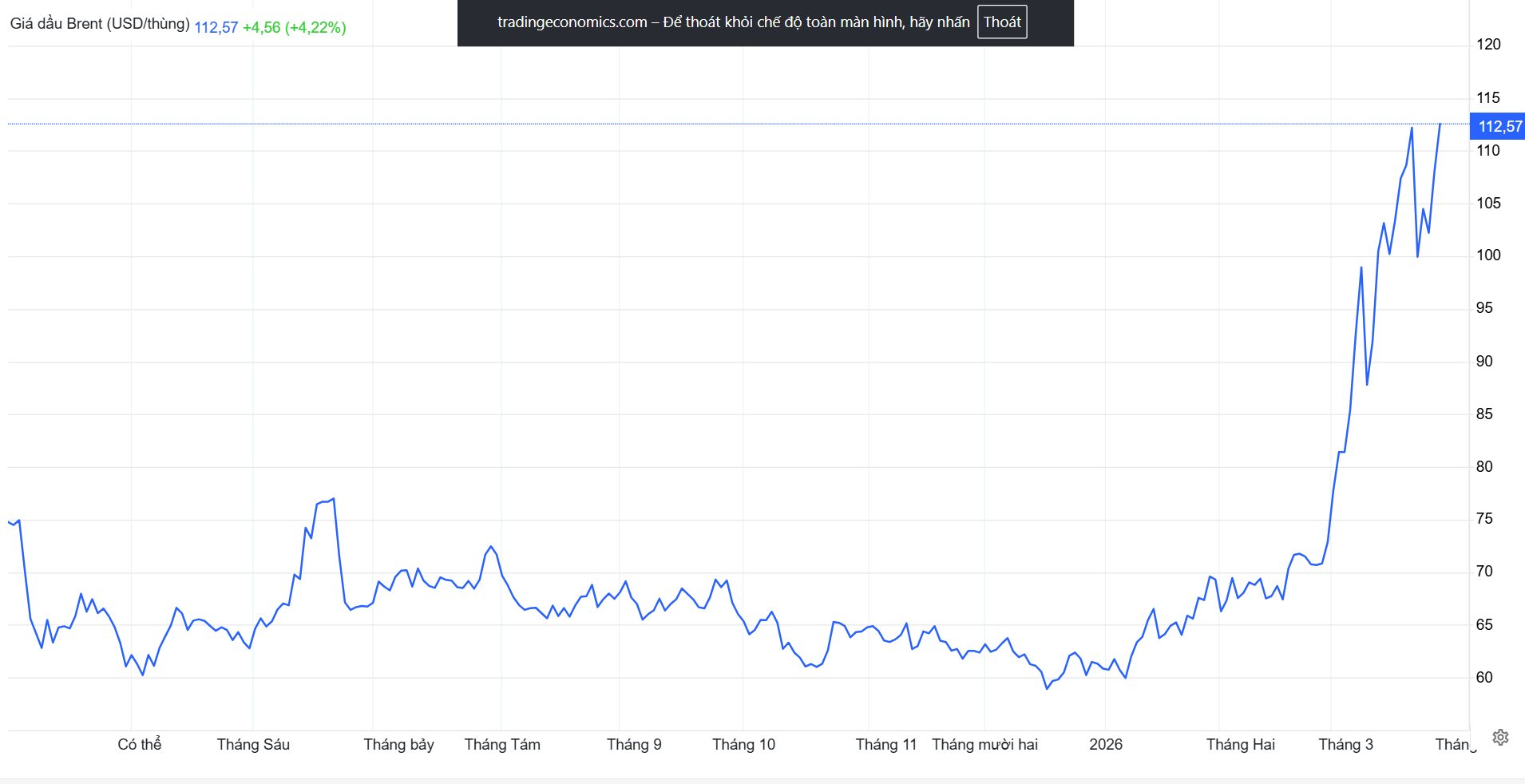 Ghi nhận vào sáng ngày 28/3 (giờ Việt Nam), giá dầu Brent giao kỳ hạn đã tăng mạnh 4,56 USD, tương đương mức tăng 4,2%, ở mức 112,57 USD một thùng.