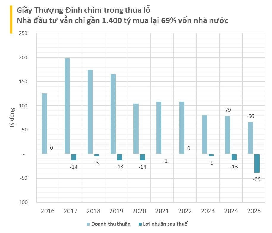 Về kết quả kinh doanh, năm 2025, Giầy Thượng Đình ghi nhận doanh thu thuần hơn 66 tỷ đồng, giảm 16% so với năm 2024. Lỗ sau thuế gần 39 tỷ đồng. Lỗ lũy kế tính tới cuối năm 2025 gần 106 tỷ đồng.