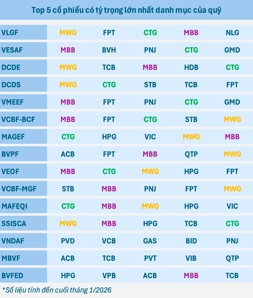Sau một năm 2025 không theo kịp VN-Index, các quỹ mở trên thị trường chứng khoán Việt Nam đã mạnh tay cơ cơ cấu danh mục trước khi bước vào năm Bính Ngọ (2026). Theo thống kê tính đến cuối tháng 1/2026, MBB của MB là cổ phiếu được lựa chọn nhiều nhất trong top 5 danh mục của 15 quỹ mở hàng đầu thị trường.