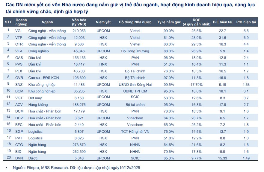 Tương tự cú hích mà Nghị quyết 68 đã mang lại cho khu vực kinh tế tư nhân, trong năm 2026 kỳ vọng được đặt vào các doanh nghiệp niêm yết vốn Nhà nước là những đơn vị đầu ngành, sở hữu nền tảng tài chính vững vàng, lượng tiền mặt dồi dào, hiệu quả hoạt động ở mức tốt (ROE trên 10%) và đang được giao dịch với mức định giá hấp dẫn.