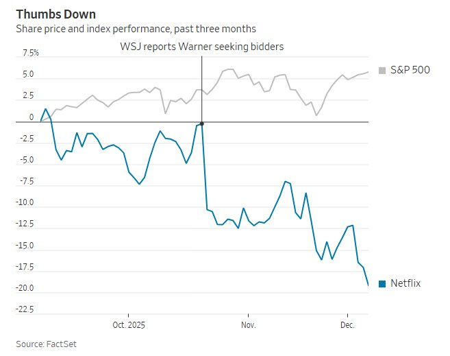 Cổ phiếu Netflix giảm gần 3% trong ngày công bố thương vụ, nối dài mức giảm 17% kể từ báo cáo tài chính quý III vào cuối tháng 10, thời điểm xuất hiện thông tin hãng đang cân nhắc mua lại Warner.
