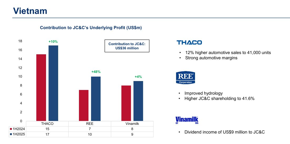 Về kết quả kinh doanh, báo cáo tài chính bán niên 2025 của JC&C ghi nhận lợi nhuận đóng góp từ thị trường Việt Nam đạt 36 triệu USD, tăng 17% so với cùng kỳ năm trước. Trong đó, THACO đóng góp 17 triệu USD (tăng 10%) nhờ doanh số ô tô đạt 41.000 xe và biên lợi nhuận cải thiện. REE đóng góp 10 triệu USD (tăng 48%), chủ yếu do điều kiện thủy văn thuận lợi hỗ trợ mảng thủy điện, Vinamilk đóng góp 9 triệu USD từ cổ tức.