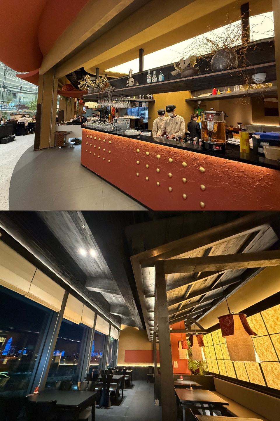 Không gian nhà hàng được thiết kế với tông màu ấm, kết hợp các yếu tố như mặt nạ, nhà sàn cùng những mảng tường trang trí bằng thổ cẩm, tổng thể đã tạo nên sắc thái cơm quê vùng núi rõ nét.
