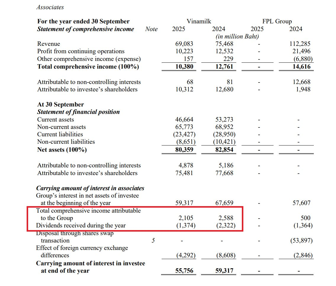 Liên quan tới Vinamilk (HoSE: VNM), ThaiBev cho biết cổ tức trong năm tài khóa 2025 thu về từ công ty sữa hàng đầu Việt Nam, tương ứng với 14,2% cổ phần, là 1,37 tỷ baht (khoảng 1.150 tỷ đồng).