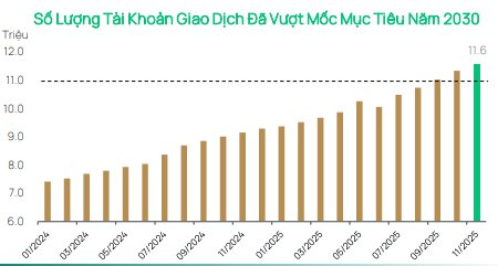 Nhà đầu tư trong nước tiếp tục là lực đỡ quan trọng của thị trường, với 237.000 tài khoản giao dịch mở mới trong tháng 11, nâng tổng số lên 11,6 triệu tài khoản và vượt sớm mục tiêu 11 triệu tài khoản vào năm 2030 của Chính phủ. Sự tham gia ngày càng rộng rãi của nhà đầu tư nội địa đang góp phần gia tăng chiều sâu thanh khoản và giảm sự phụ thuộc vào bất kỳ nhóm nhà đầu tư nào.
