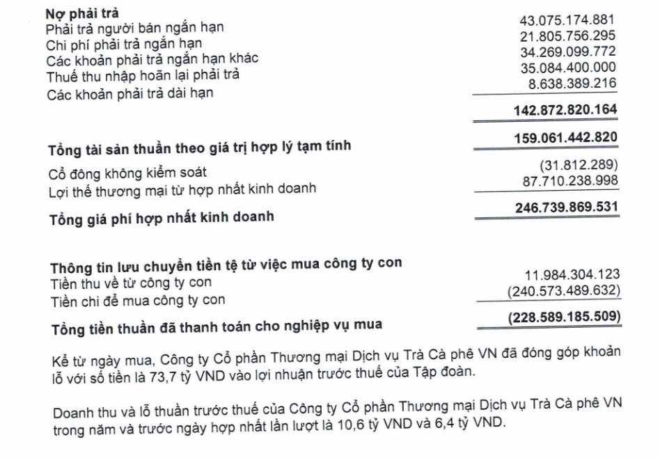 Riêng về thương vụ mua lại CTCP Thương mại Dịch vụ Trà Cà phê Việt Nam (chính là The Coffee House) từ Seedcom, Golden Gate cho biết, sau khi chi 240,6 tỷ đồng để mua lại, doanh thu và lỗ thuần trước thuế của The Coffee House trong năm 2025 và trước ngày hợp nhất lần lượt là 10,6 tỷ đồng và 6,4 tỷ đồng.