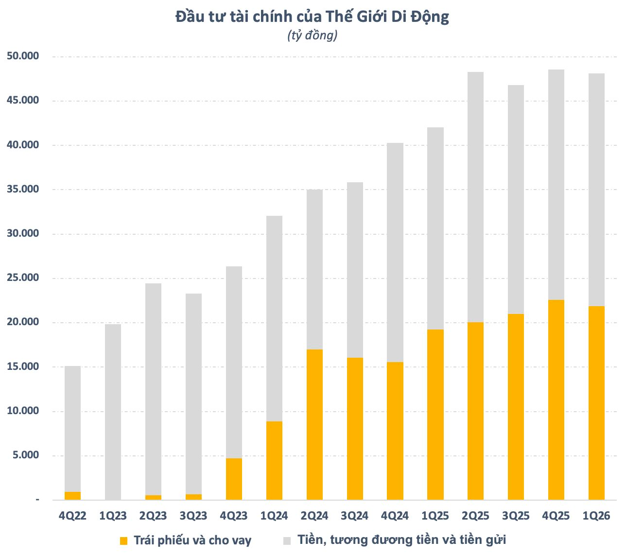 Theo BCTC quý 1/2026, CTCP Đầu tư Thế Giới Di Động (mã MWG) tiếp tục duy trì hoạt động đầu tư tài chính trong những tháng đầu năm 2026. Số dư tiền, tương đương tiền, tiền gửi, đầu tư trái phiếu và cho vay tính đến ngày 31/3 ở mức trên 48.000 tỷ đồng, giảm nhẹ so với mức kỷ lục ghi nhận cuối năm ngoái.