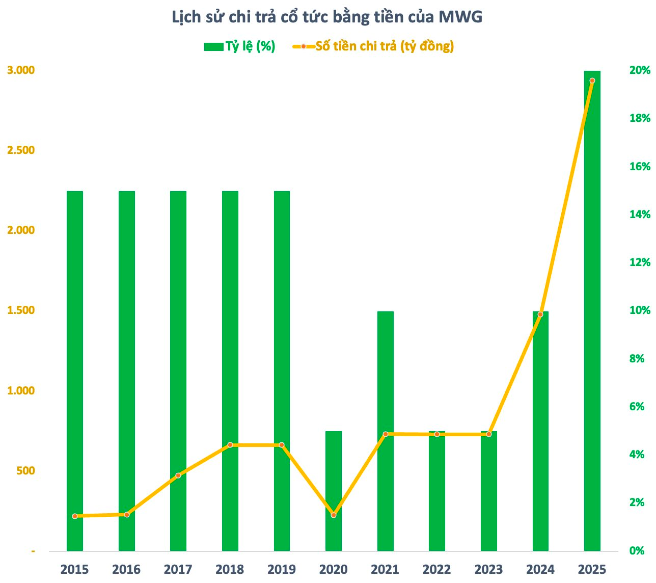 Với gần 1,47 tỷ cổ phiếu đang lưu hành, MWG dự kiến sẽ chi gần 3.000 tỷ đồng để trả cổ tức cho cổ đông. Đây là số tiền kỷ lục mà doanh nghiệp bán lẻ của ông Nguyễn Đức Tài chia cho cổ đông. Thời gian thực hiện dự kiến được chia thành 2 đợt vào quý 3 và 4/2026, mỗi đợt chi trả 1.000 đồng/cp.