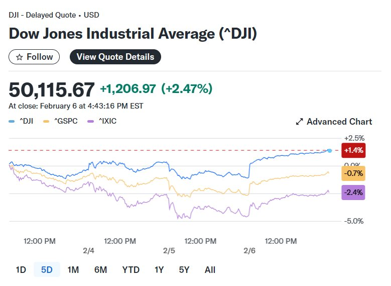 TTCK Mỹ tuần qua đã ghi nhận nhiều biến động mạnh. Ngày 6/2, chỉ số Dow Jones lần đầu tiên có phiên lập đỉnh trên 50.000 điểm, S&P 500 và Nasdaq Composite cùng tăng 2%. Các chỉ số chính tăng phần nào xoa dịu đà giảm trước đó trong tuần.