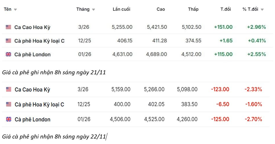 Giá ca cao và cà phê trong phiên 22/11 chứng kiến sự đảo chiều mạnh so với đà tăng trước đó. Ca cao Hoa Kỳ giảm từ 5.255 USD xuống 5.159 USD, đánh dấu một phiên điều chỉnh rõ rệt sau khi tăng gần 3% vào ngày 21/11. Cà phê Arabica New York cũng suy yếu, lùi từ 406,15 cent/lb về 400 cent/lb, xoá sạch mức tăng nhẹ trước đó và cho thấy lực bán kỹ thuật đang chiếm ưu thế. Mạnh nhất là cà phê Robusta London, giảm sâu từ 4.631 USD/tấn xuống 4.506 USD/tấn, tương đương mất 125 USD và là mức giảm mạnh nhất trong ba mặt hàng. Diễn biến này phản ánh sự chốt lời đồng loạt hoặc tác động từ yếu tố cung - cầu khiến nhóm nông sản đồng loạt điều chỉnh sau phiên phục hồi ngày 21/11.