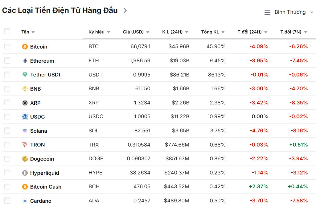 Vốn hóa toàn thị trường mã hóa cũng giảm 2,94% so với hôm qua, hiện còn 2.290 tỉ USD. Cả thị trường tiền mã hóa đang chìm trong sắc đỏ sau cú sập của Bitcoin. Ethereum, tiền mã hóa lớn thứ hai thế giới hiện còn 1.989 USD, giảm 3,6% trong vòng 24 giờ. BNB mất 2,55% giá trị, hiện còn 612 USD mỗi token. XRP giảm 2,68% xuống còn 1,3 USD. Trong khi đó, Solana giảm 4,47%, về mốc 82 USD.