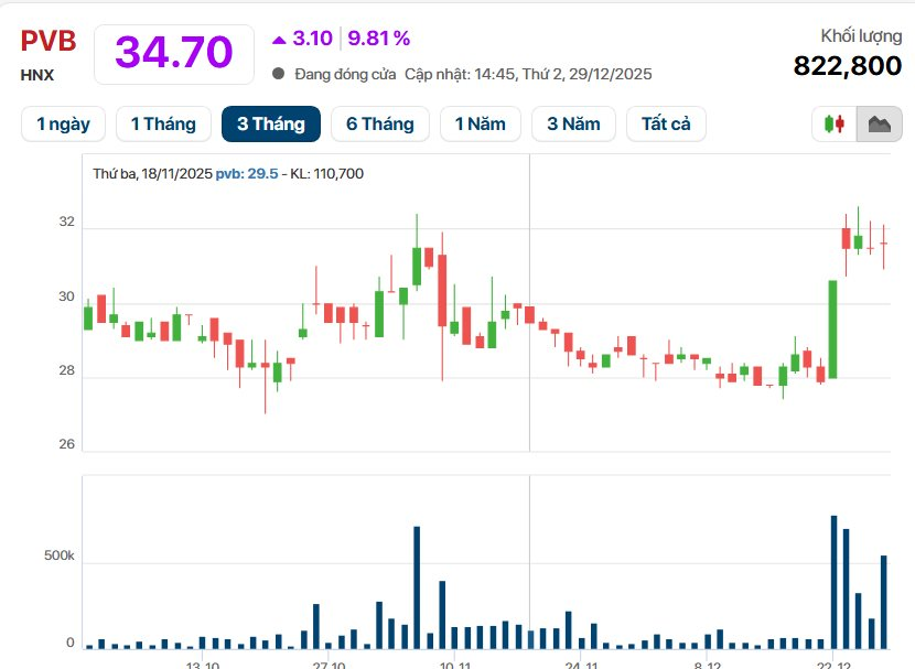 Trong bối cảnh chỉ số chung thăng hoa, nhóm Dầu khí trở thành tâm điểm với sắc xanh bao phủ diện rộng, thậm chí nhiều mã tăng mạnh. Cụ thể, PVB gây ấn tượng mạnh nhất khi sớm tăng kịch trần 9,81%, đóng cửa tại mức giá 34.700 đồng/cổ phiếu.