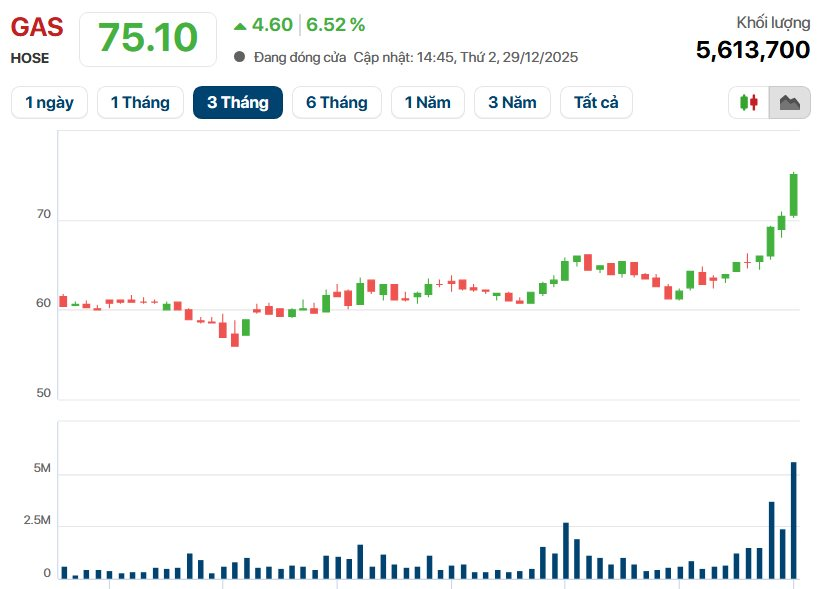 "Anh cả" ngành khí GAS cũng không kém cạnh khi tăng tốc mạnh mẽ 6,52%, leo lên mức giá 75.100 đồng/cổ phiếu, đóng vai trò trụ cột nâng đỡ chỉ số.
