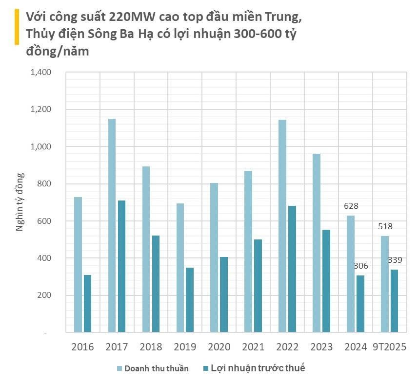 Hoạt động tài chính cũng ghi nhận điểm sáng với doanh thu hơn 11 tỷ đồng, gấp đôi cùng kỳ, chủ yếu nhờ lãi tiền gửi từ nguồn tiền mặt dồi dào. Khấu trừ các chi phí, Sông Ba Hạ báo lãi sau thuế quý 3 gần 189 tỷ đồng, tăng 51% so với quý 3/2024.