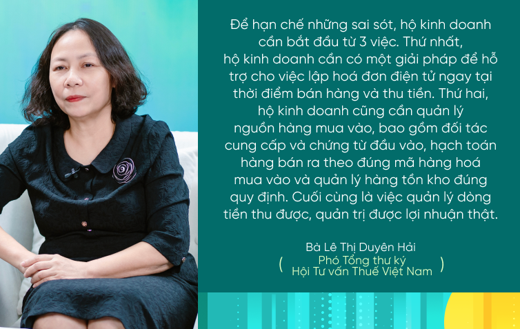 Bên cạnh bài toán thu - chi và dòng tiền, thuế và sổ sách cũng là nỗi lo lớn với nhiều hộ kinh doanh. Các chuyên gia chỉ ra những sai sót phổ biến của hộ kinh doanh như ghi chép doanh thu không kịp thời, sổ sách và dòng tiền không khớp, xuất hóa đơn sai thời điểm hoặc sử dụng tài khoản cá nhân cho hoạt động kinh doanh. Đồng thời giúp tiểu thương hiểu rõ cách phân nhóm hộ kinh doanh theo doanh thu, nghĩa vụ thuế tương ứng và những việc cần chuẩn bị trước các thay đổi chính sách.