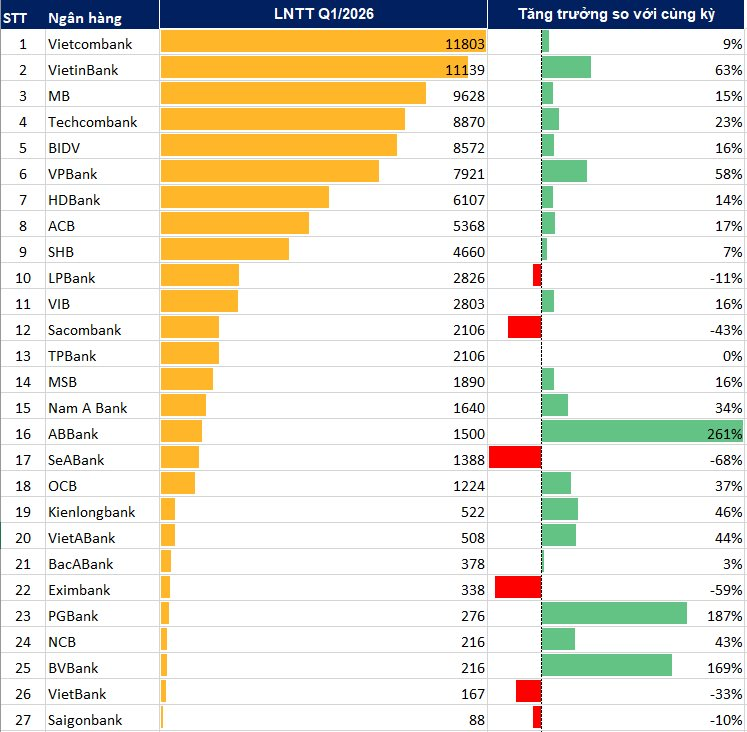 Tổng lợi nhuận của 27 ngân hàng đạt hơn 94 nghìn tỷ đồng, tăng 14% so với cùng kỳ năm 2025. Trong đó có 6/27 ngân hàng ghi nhận tăng trưởng âm.