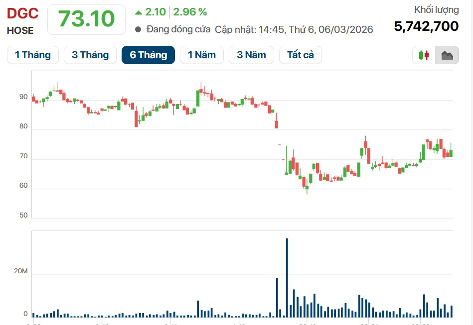 Trên thị trường chứng khoán, sau giai đoạn điều chỉnh do tâm lý thận trọng về rủi ro pháp lý ngành khoáng sản, cổ phiếu DGC đã ghi nhận phiên tăng 2,96% lên mức 73.100 đồng/cp vào ngày 6/3/2026.