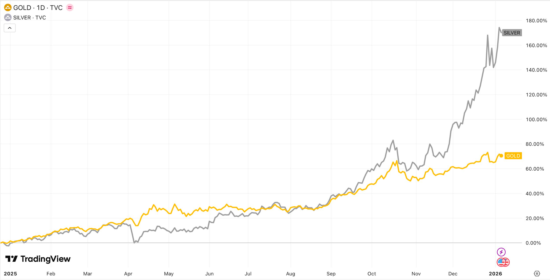 Vàng cũng có một năm 2025 tăng giá mạnh gần 65%. Trong bối cảnh thế giới còn đối mặt với rủi ro địa chính trị, biến động chính sách tiền tệ và nợ công toàn cầu, vàng tiếp tục giữ vai trò là tài sản trú ẩn an toàn. Việc các ngân hàng trung ương trên thế giới có xu hướng tăng dự trữ vàng, giảm phụ thuộc vào USD cũng là một yếu tố hỗ trợ giá của loại tài sản này.