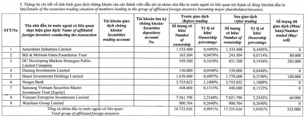 Hanoi Investments Holdings Limited mua thêm 100.000 cổ phiếu, nâng sở hữu từ 1,67 triệu lên 1,77 triệu cổ phiếu, tương ứng tỷ lệ tăng từ 0,49% lên 0,52%. Vietnam Enterprise Investments Limited (VEIL) mua 60.000 cổ phiếu, nâng nắm giữ từ 7,56 triệu lên 7,62 triệu cổ phiếu, tương ứng tỷ lệ sở hữu tăng từ 2,22% lên 2,23% – mức cao nhất trong nhóm quỹ.