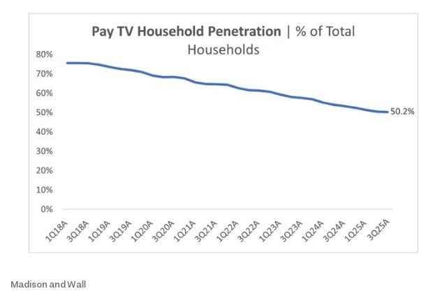 Theo ước tính của công ty tư vấn Madison and Wall, lần đầu tiên, số hộ gia đình Mỹ đăng ký các dịch vụ TV cáp hoặc vệ tinh truyền thống dự kiến sẽ chỉ còn xấp xỉ 50% tổng số hộ gia đình vào cuối năm 2025.