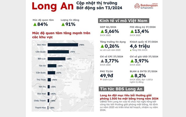 Theo dữ liệu từ Batdongsan.com.vn, mức độ quan tâm bất động sản tại Bến Lức đã tăng 68% trong tháng 3/2024, cho thấy khu vực này đang dần thu hút sự chú ý của thị trường.
