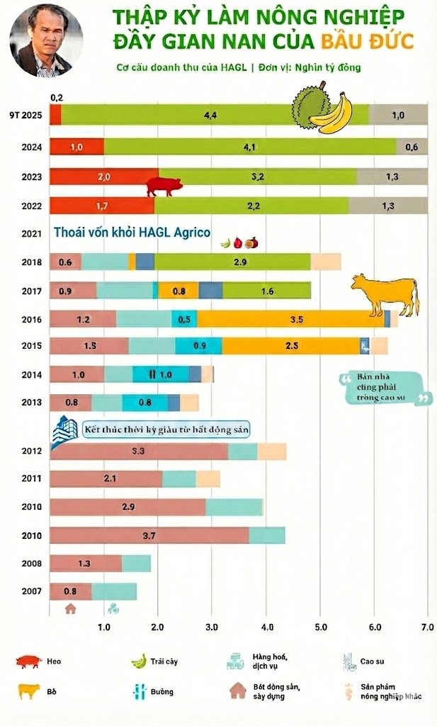 Biểu đồ diễn biến cơ cấu doanh thu HAGL (2009 - 9T/2025): Sự "đổi ngôi" ngoạn mục trong cấu trúc tài chính được thể hiện qua sự thoái trào của các trụ cột cũ (Bất động sản, Chăn nuôi - vùng màu xám và đỏ) để nhường không gian tăng trưởng tuyệt đối cho mảng Trái cây (vùng màu xanh). Đặc biệt từ năm 2024 đến 9 tháng đầu năm 2025, mảng Trái cây đã bứt phá mạnh mẽ, chính thức trở thành động lực tăng trưởng duy nhất và bền vững của tập đoàn. Nguồn dữ liệu: BCTC HAGL