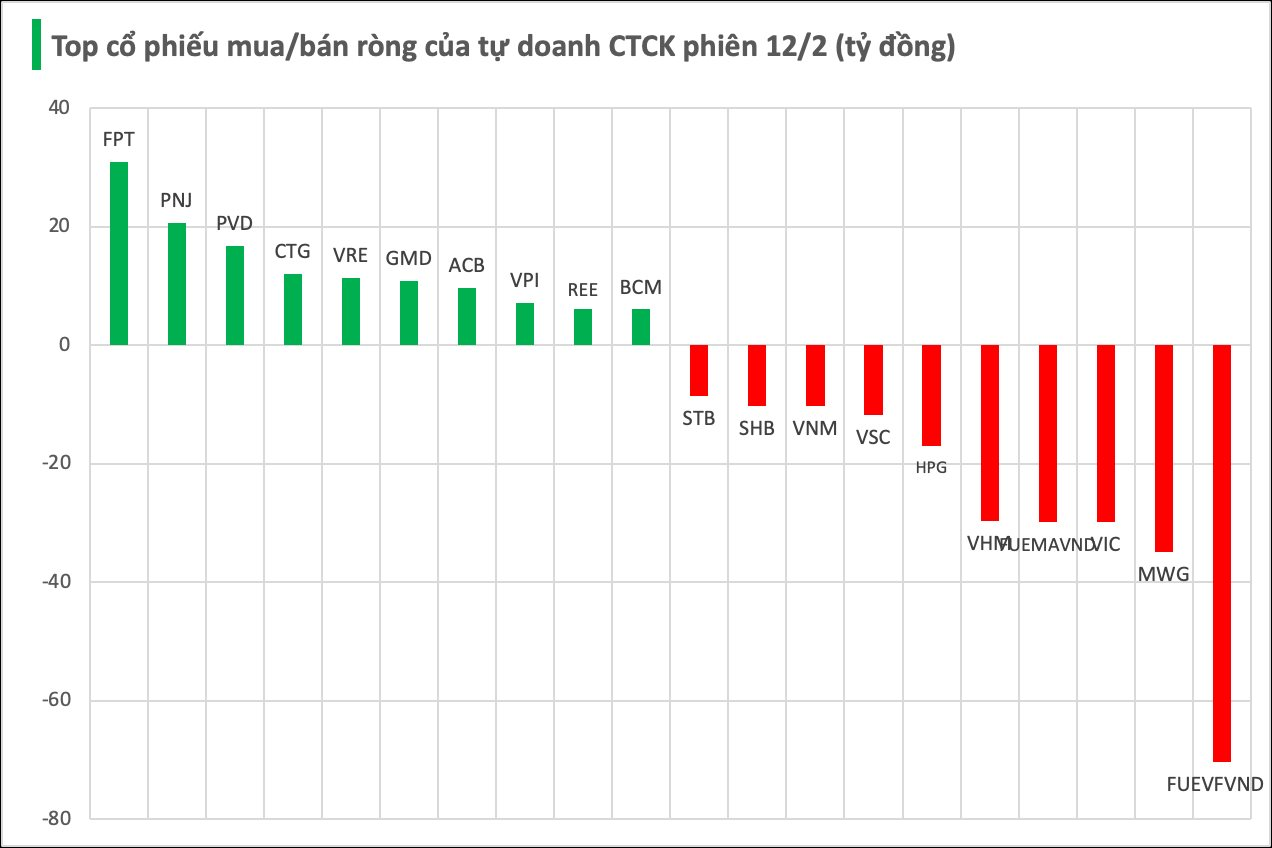 Cụ thể, nhóm tự doanh CTCK bán ròng mạnh nhất tại FUEVFVND với giá trị -70 tỷ đồng, tiếp theo là MWG (-35 tỷ), VIC (-30 tỷ), FUEMAVND (-30 tỷ) và VHM (-30 tỷ đồng). Một số cổ phiếu khác cũng ghi nhận lực bán ròng đáng kể như HPG (-17 tỷ), VSC (-12 tỷ), VNM (-10 tỷ), SHB (-10 tỷ) và STB (-9 tỷ đồng).