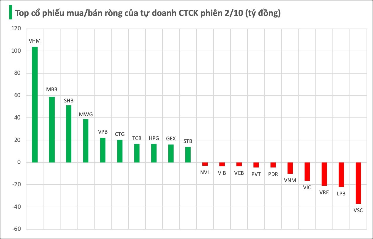 Cụ thể, VHM và MBB được mua ròng với giá trị lần lượt là 104 tỷ và 59 tỷ đồng. Theo sau là SHB (51 tỷ), MWG (39 tỷ), VPB (22 tỷ), CTG (20 tỷ), TCB (17 tỷ), HPG (17 tỷ), GEX (16 tỷ) và STB (14 tỷ đồng) đều được tự doanh CTCK mua mạnh.