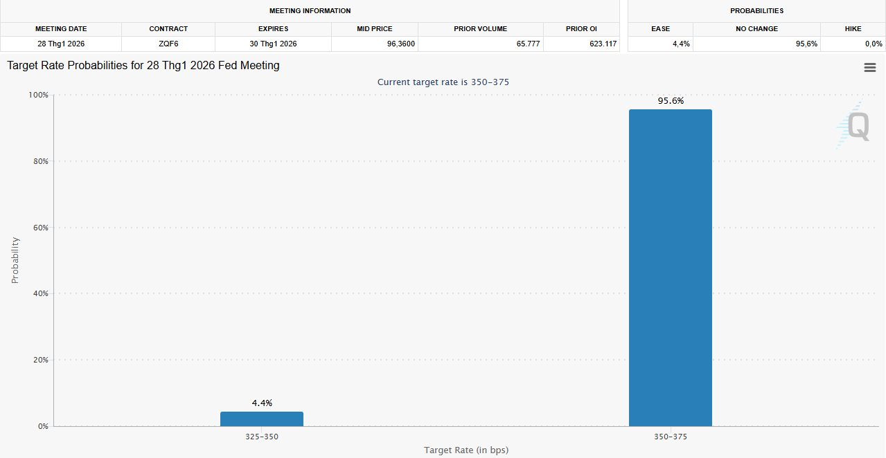 Các nhà giao dịch hiện rút lại hầu hết dự đoán Fed sẽ cắt giảm lãi suất vào cuối tháng 1 vì tỷ lệ thất nghiệp giảm nhiều hơn dự kiến. Theo FedWatch Tool của CME Group, thị trường hiện dự đoán 95,6% khả năng Fed sẽ giữ nguyên lãi suất tháng này và chỉ 4,4% dự đoán hạ lãi suất 0,25 điểm phần trăm.