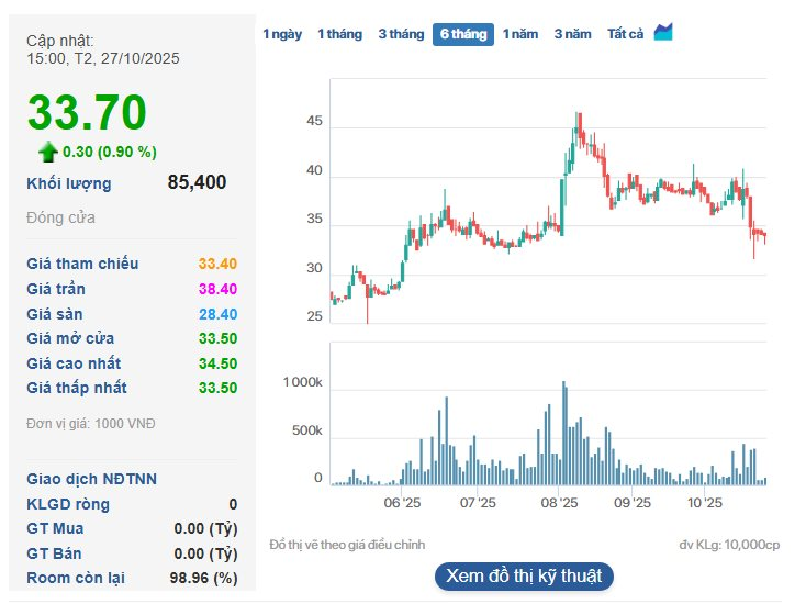 Trên thị trường chứng khoán, cổ phiếu MML đã có giai đoạn tăng trưởng mạnh từ tháng 5 đến tháng 8/2025, đạt đỉnh quanh mức 45.000 đồng/cp. Tuy nhiên, cổ phiếu này đã điều chỉnh trong những tháng gần đây. Kết thúc phiên giao dịch ngày 27/10/2025, giá cổ phiếu MML dừng ở mức 33.700 đồng/cp.