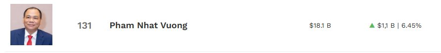 Còn theo cập nhật mới nhất từ Forbes tại ngày 10/10, ông Phạm Nhật Vượng có khối tài sản 18,1 tỷ USD, xếp thứ 131 trong danh sách những người giàu nhất thế giới. Khối tài sản của người giàu nhất Việt Nam hiện còn lớn lớn cả Chủ tịch Samsung Lee Jae-yong, tỷ phú Thai Lan Charoen Sirivadhanabhakdi – Chủ tịch TCC Group, tỷ phú sáng lập Telegram Pavel Durov, tỷ phú AI Edwin Chen Fraser and Neave (F&N), nhà sáng lập Thai Beverage, hay huyền thoại đầu tư Ray Dalio.