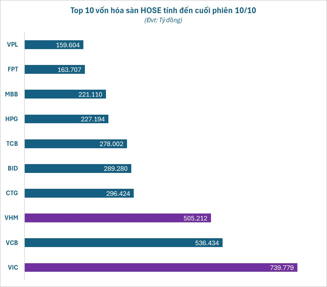 Tính đến cuối phiên 10/10, vốn hóa thị trường của Vingroup lập kỷ lục gần 740.000 tỷ đồng (~28,5 tỷ USD). Con số này đưa tập đoàn của tỷ phú Phạm Nhật Vượng vững vàng ở vị trí số 1 toàn sàn chứng khoán và bỏ xa top phía sau. Vinhomes xếp vị trí thứ 3 trong danh sách vốn hóa với hơn 505.000 tỷ đồng.
