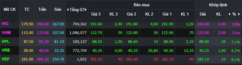 Nổi bật trong phiên phải kể tới nhóm cổ phiếu Vingroup. Hai mã VIC và VHM đồng loạt tăng kịch trần 7%, lần lượt đóng cửa tại mức 192.000 đồng/cp và 123.000 đồng/cp – đều là đỉnh giá mới. Đáng chú ý đây là phiên tăng trần thứ 2 liên tiếp của Vinhomes.