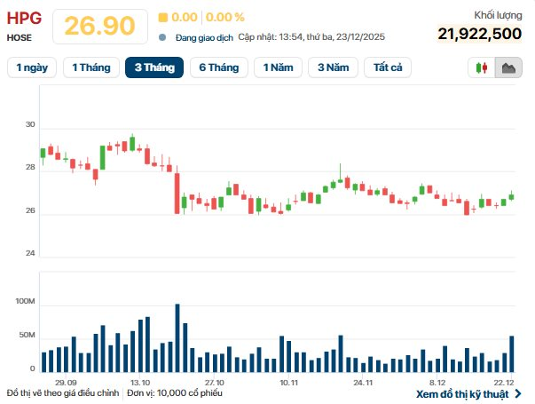Trên thị trường chứng khoán, phiên chiều ngày 23/12, cổ phiếu HPG vẫn giữ nguyên mức giá so với phiên trước đó là 26.900 đồng/cp.