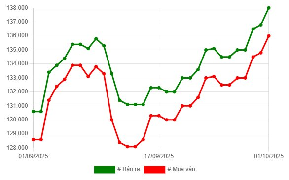 Đến trưa 1/10, thị trường vàng trong nước bùng nổ khi giá vàng miếng SJC bật tăng mạnh. Tại Công ty Vàng bạc Sài Gòn (SJC), Bảo Tín Minh Châu và Tập đoàn DOJI, giá vàng miếng SJC đồng loạt leo lên 136 – 138 triệu đồng/lượng – mức giá chưa từng có trong lịch sử, tăng 1,2 triệu đồng/lượng ở cả hai chiều mua – bán. Biên độ chênh lệch được duy trì ở mức 2 triệu đồng/lượng.