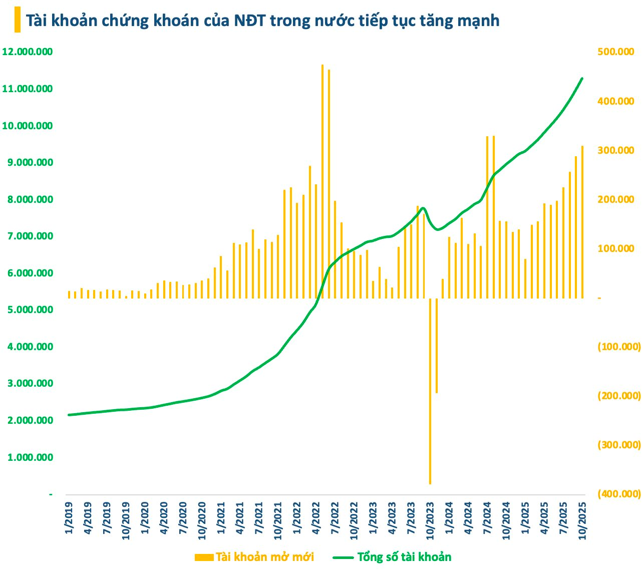 Luỹ kế từ đầu năm, số lượng tài khoản chứng khoán của nhà đầu tư trong nước đã tăng hơn 2 triệu tài khoản. Tính đến cuối tháng 10/2025, nhà đầu tư cá nhân có tổng cộng gần 11,3 triệu tài khoản, tương đương khoảng 11% dân số, qua đó hoàn thành mục tiêu trước thời hạn 2030. Số lượng tài khoản chứng khoán tại Việt Nam được kỳ vọng sẽ còn tăng mạnh hơn nữa sau khi nâng hạng.