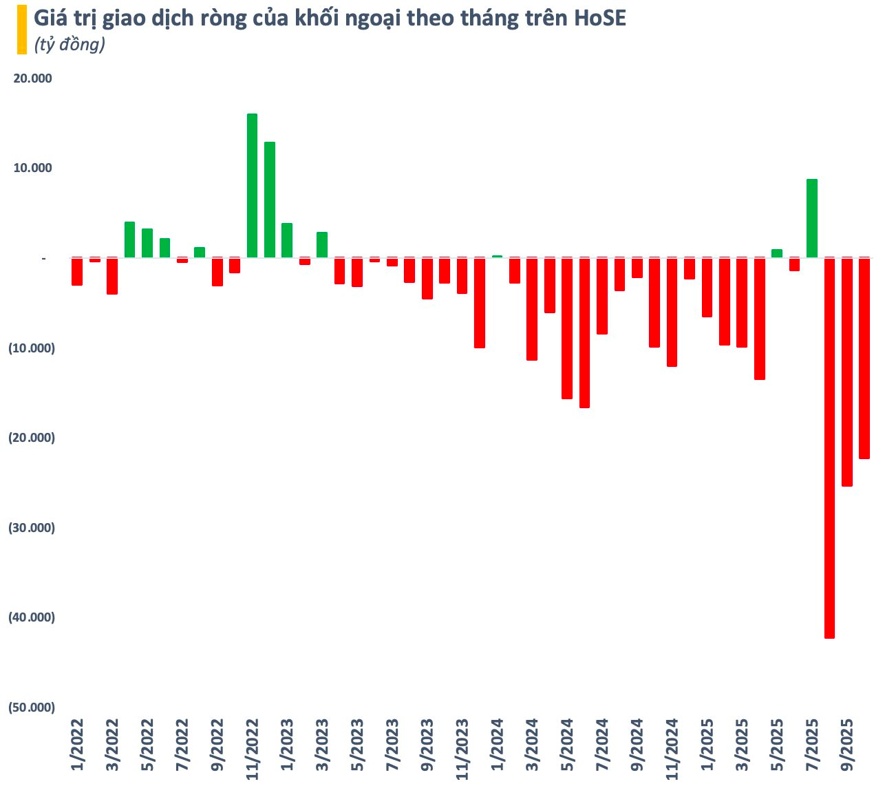 Khối ngoại là lực lượng gây áp lực lớn lên thị trường. Riêng trong tháng 10, khối ngoại đã bán ròng hơn 22.000 tỷ trên HoSE, kéo dài chuỗi bán ròng lên 3 tháng liên tiếp. Mặc dù xung lực bán đã có phần hạ nhiệt đôi chút so với 2 tháng trước đó nhưng lực bán vẫn là rất mạnh so với giai đoạn nửa đầu năm.