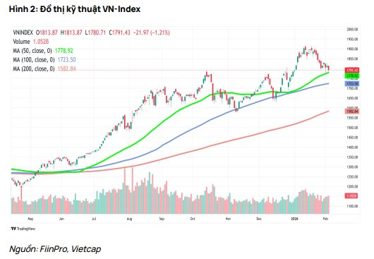Về triển vọng thị trường, Chứng khoán Vietcap nhận định dòng tiền có thể suy yếu do tâm lý thận trọng của nhà đầu tư trước kỳ nghỉ Tết kéo dài. Ngoài ra, thị trường tài chính và hàng hóa thế giới đang biến động mạnh, trong khi thanh khoản hệ thống ngân hàng có dấu hiệu căng thẳng trở lại, thể hiện qua việc lãi suất qua đêm liên ngân hàng tăng lên trên 10% trong những ngày đầu tháng 2.