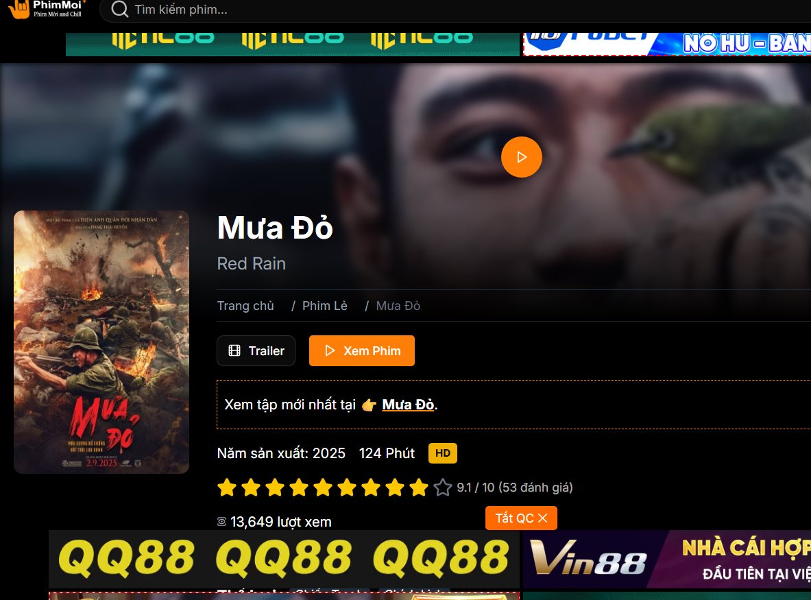 Trang web phim lậu ăn cắp bản quyền Phim Mưa đỏ, chất lượng thấp và đầy rẫy quảng cáo