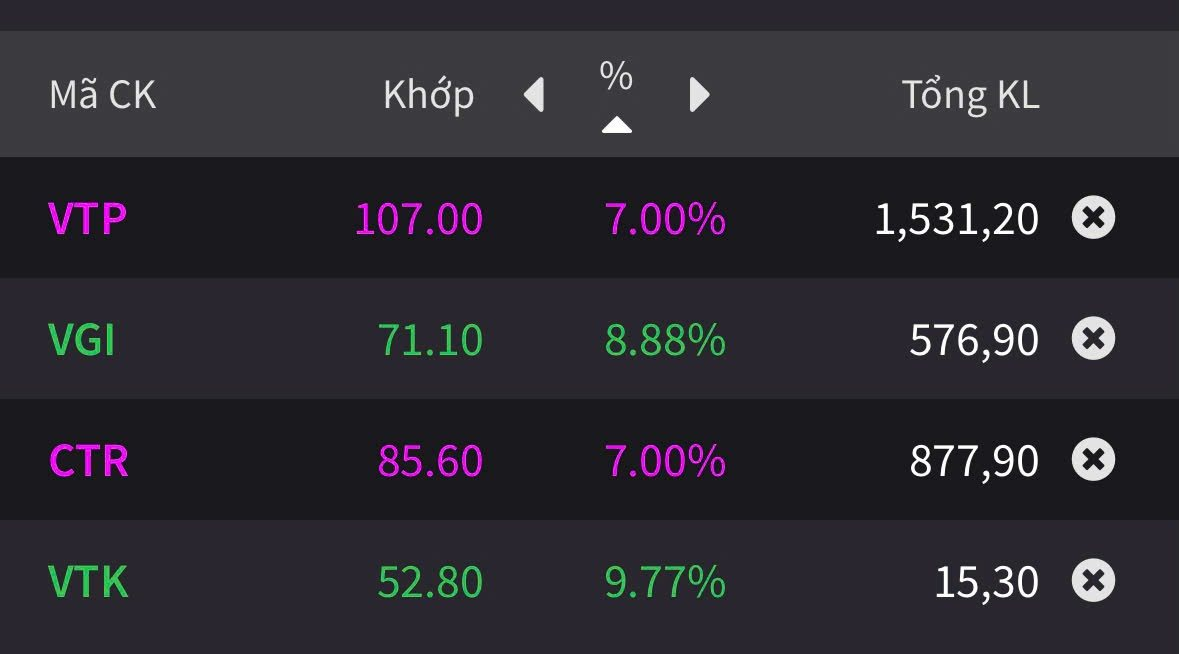 Thanh khoản của các cổ phiếu cũng ở mức cao so với các phiên trước đó. Kết phiên sáng, đã có hơn 1,5 triệu cổ phiếu VTP, 576.900 cổ phiếu VGI, 877.900 cổ phiếu CTR và 15.300 cổ phiếu VTK được giao dịch.