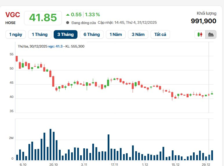 Trên thị trường chứng khoán, kết thúc phiên giao dịch ngày 31/12/2025, cổ phiếu VGC đóng cửa tại mức giá 41.850 đồng/cp, tăng 1,33 %, khối lượng giao địch gần 1 triệu cổ phiếu.