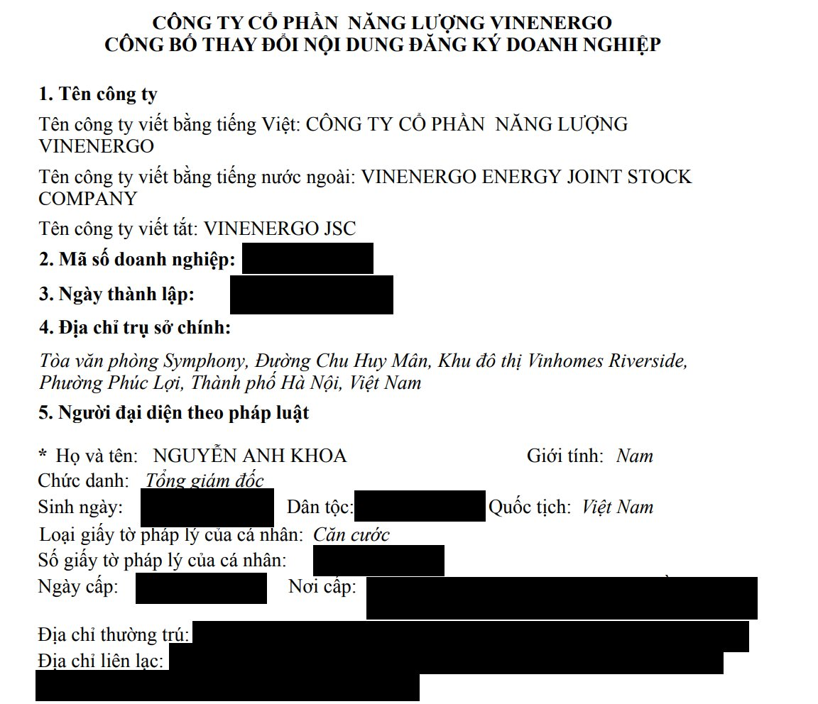 CTCP Năng lượng VinEnergo thuộc hệ sinh thái Vingroup của tỷ phú Phạm Nhật Vượng vừa có công bố thay đổi nội dung đăng ký doanh nghiệp. Công ty có Tổng giám đốc và người đại diện pháp luật mới là ông Nguyễn Anh Khoa (sinh năm 1989).