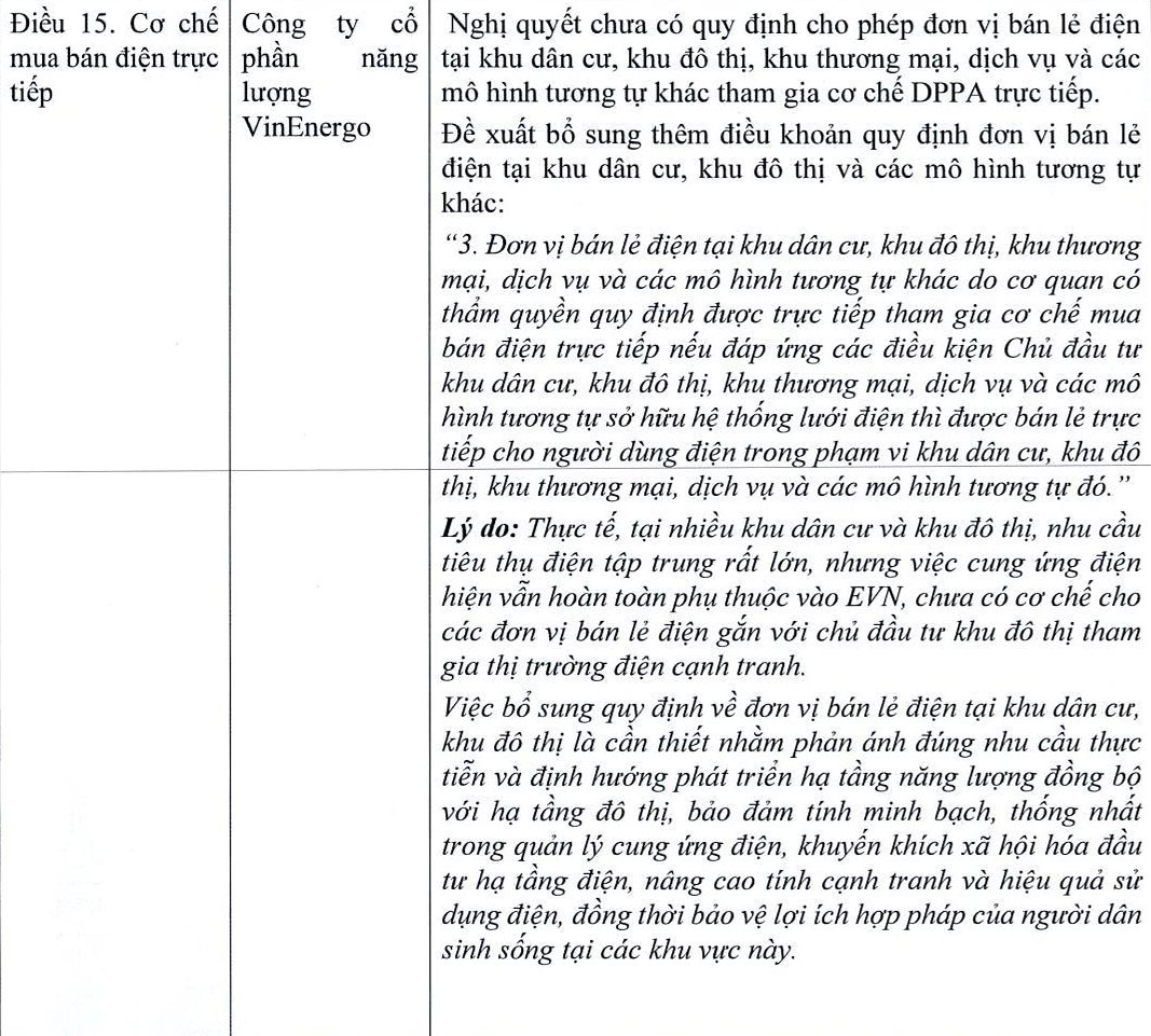 Đóng góp ý kiến về việc này, VinEnergo thuộc hệ sinh thái Vingroup cho rằng dự thảo chưa có quy định cho phép đơn vị bán lẻ điện tại khu dân cư, khu đô thị, khu thương mại, dịch vụ và các mô hình tương tự khác tham gia cơ chế mua bán điện trực tiếp (Direct Power Purchase Agreement-DPPA) trực tiếp.