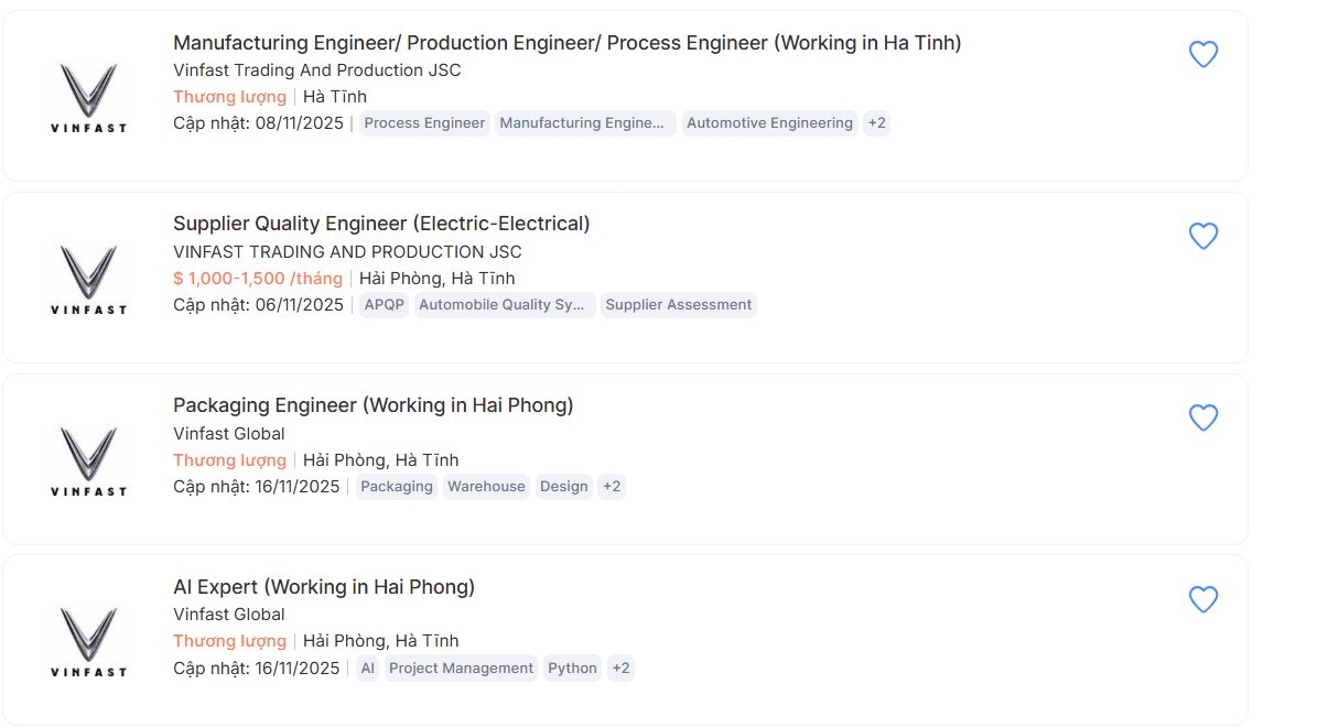 Bên cạnh lực lượng sản xuất trực tiếp, VinFast cũng đang tìm kiếm các nhân sự kỹ thuật cao cho cả hai địa điểm. Theo thông tin đăng tuyển trên các nền tảng việc làm, vị trí Kỹ sư Chất lượng Nhà cung cấp (Supplier Quality Engineer) mảng Điện - Điện tử làm việc tại Hải Phòng và Hà Tĩnh đang được chào mức lương từ 1.000 - 1.500 USD/tháng (tương đương khoảng 28 - 38 triệu đồng).