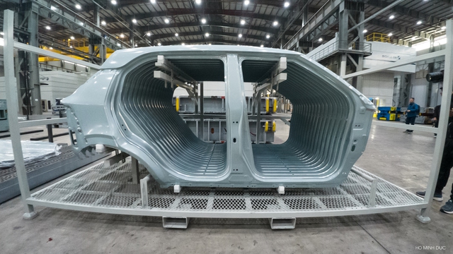 Công nhân kiểm tra tấm dập tại nhà máy VinFast Hải Phòng.